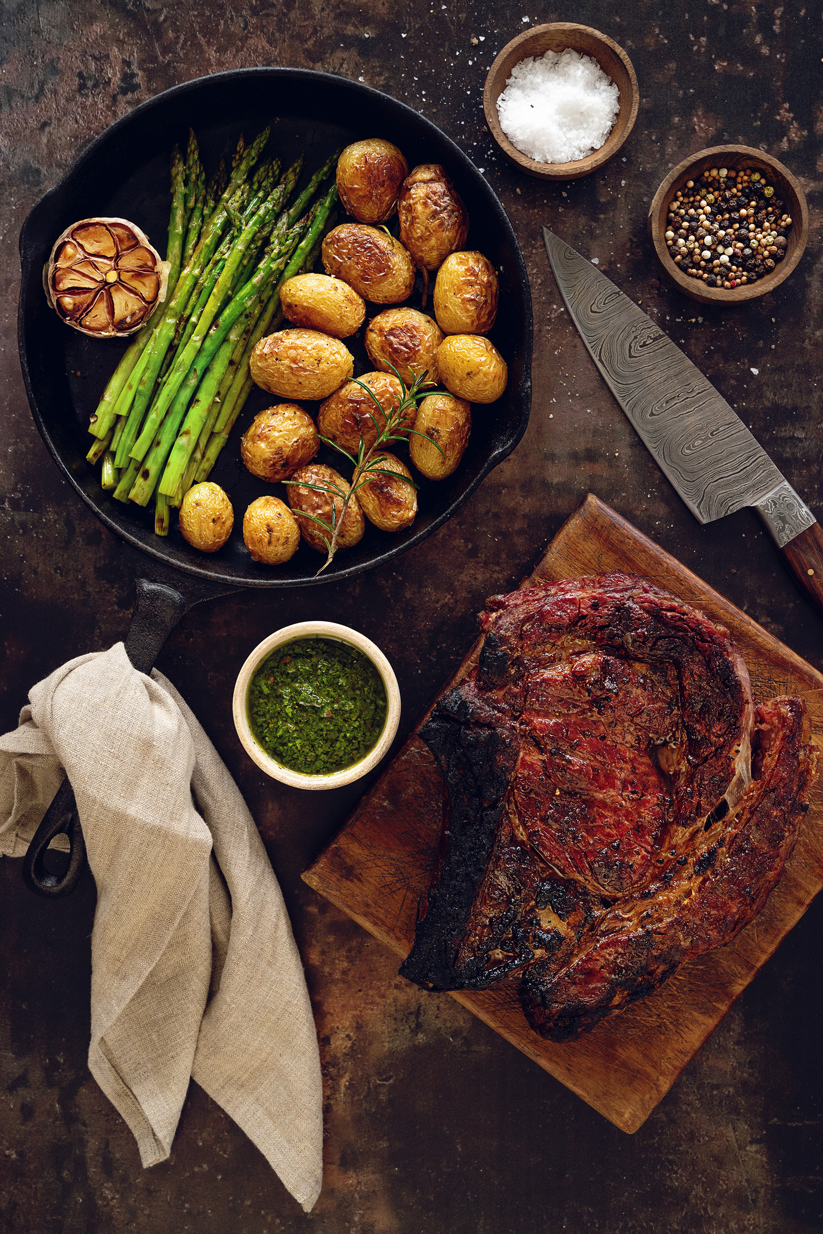 Stailaus ja sommitteluKaupallisissa ruokakuvauksissa käytetään usein valeruokaa ja valmistellaan aterioita tuntikausia, jotta ne saadaan näyttämään täydellisiltä kuumien studiovalojen alla. Oikeaa ruokaa kuvattaessa tuoreus on kaikki kaikessa – olipa kyseessä sitten salaatti tai lämmin uunituore ateria. Ajoituksen ja nopeuden merkitys on keskeinen. Nopea vesisuihkaus lisää pisaroita ja kiiltoa, jolloin hedelmät ja vihannekset näyttävät tuoreilta. Höyry vedenkeittimestä tai piilotetusta kuuman veden kulhosta voi saada ruoan näyttämään tulikuumalta ja ruokahalua herättävältä. Eri esineitä, kuten merisuolaa, yrttejä, koristeita ja kastikkeita, voidaan sijoittaa strategisesti tekstuurin ja tasapainon lisäämiseksi. Mutta esillepano on kaikki kaikessa! Luo kontrasti tai täydennä ateriaa lautasten ja pintojen väreillä ja tyylillä. Puinen pöytä lisää maalaismaista tunnelmaa, musta pöytäliina saa värit ponnahtamaan esiin luoden modernin ilmeen ja valkoinen lautanen valkoisella marmoripinnalla luo puhtaan, minimalistisen ilmeen. Se, miten esittelet ruokasi, kertoo suuren osan tarinasta ja auttaa loihtimaan tunnelman, jonka haluat katsojan tuntevan: onko ruoka lämmintä ja lohduttavaa vai onko se ylellinen taideteos?