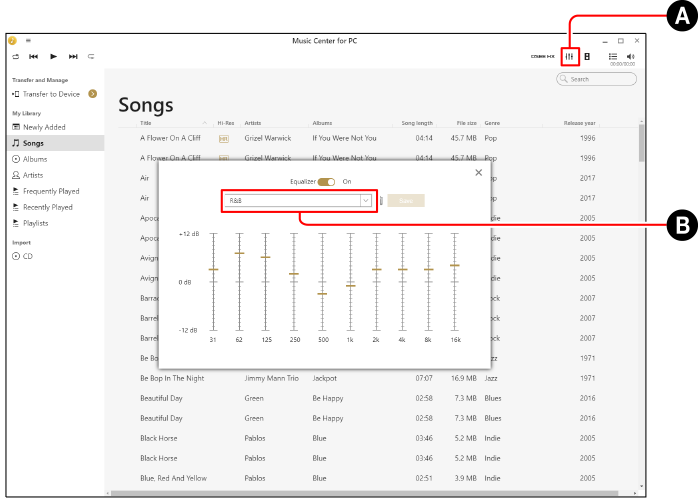 - Säädetty äänenlaatu voidaan tallentaa taajuuskorjaimen esiasetukseksi. Lisäksi yksittäisille kappaleille tai albumeille voidaan määrittää taajuuskorjaimen esiasetuksia.