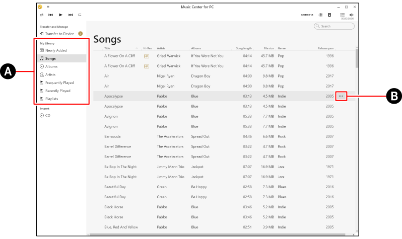 - Voit valita kaikki kappaleet painamalla [A]-näppäintä samalla, kun pidät [Ctrl]-näppäimen painettuna.