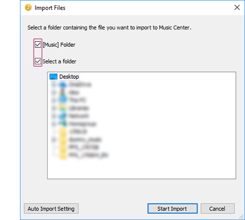 - Jos vaiheessa 1 napsautetaan näytössä [Automaattiset tuontiasetukset], Music Center for PC tuo automaattisesti sisällön määritetystä kansiosta, kun se käynnistyy.