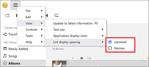 (Valikko) näytön vasemmassa yläkulmassa ja valitse sitten [Listanäytön riviväli] seuraavista: [vakio] tai [Kapea].