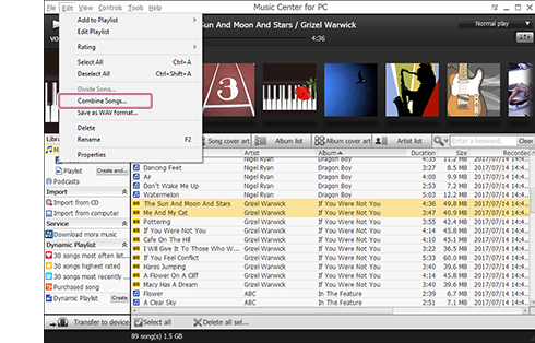 Valitse [Muokkaa]-valikosta [Yhdistä kappaleet...].