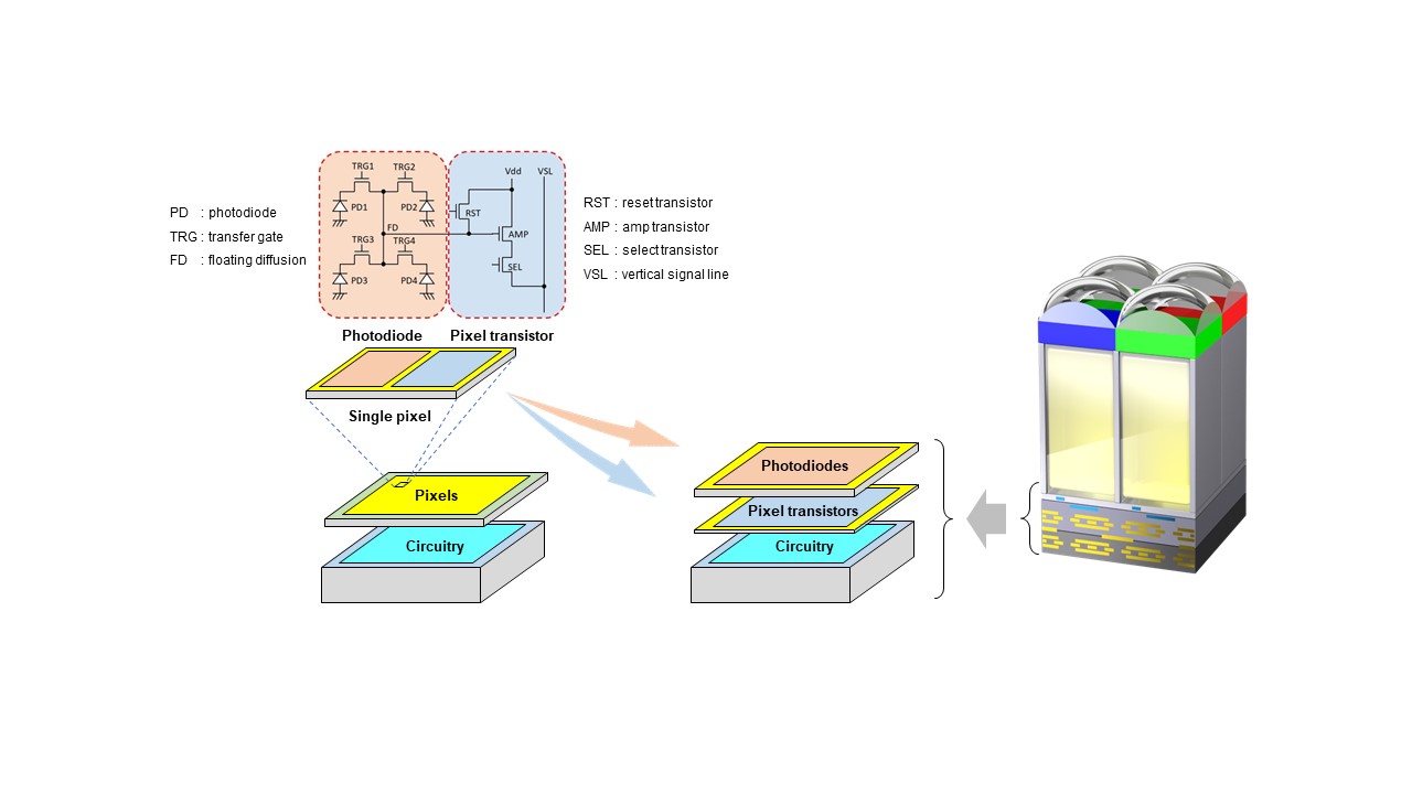 In conventional stacked CMOS image sensors, by contrast, the photodiodes and pixel transistors sit alongside each other on the same substrate. The new stacking technology enables adoption of architectures that allow the photodiode and pixel transistor layers to each be optimized, thereby approximately doubling saturation signal level relative to conventional image sensors and, in turn, widening dynamic range.